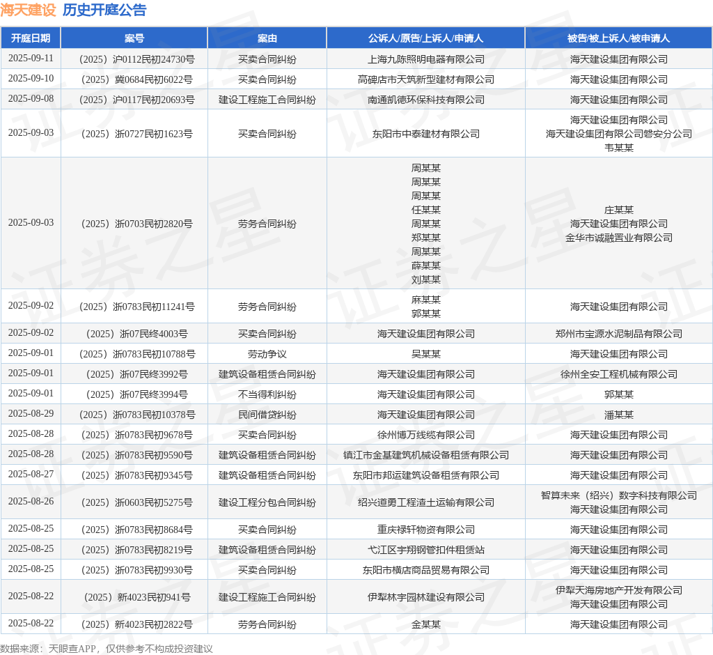 本站消息,根据天眼查APP显示,近日公布了一则海天建设集团有限公司作为被告/被上诉人的开庭公告,详细内容如下: